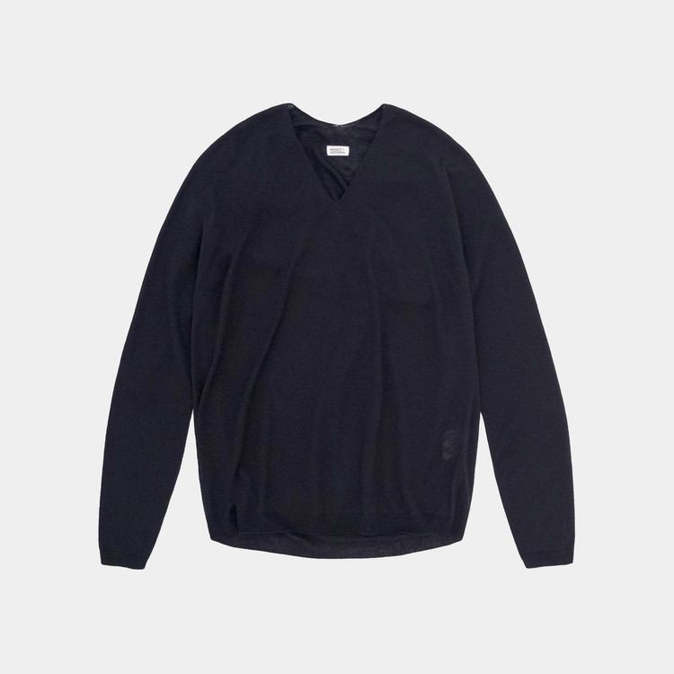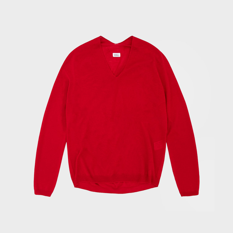봉제선 없이 하나로 완성되는 홀가먼트(WholeGarment) 방식으로 제작된 브이넥 니트 풀오버입니다.